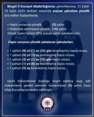Polis, Bingöl’de çeşitli suçlardan aranan 21 kişiyi gözaltına aldı, 5’i tutuklandı.